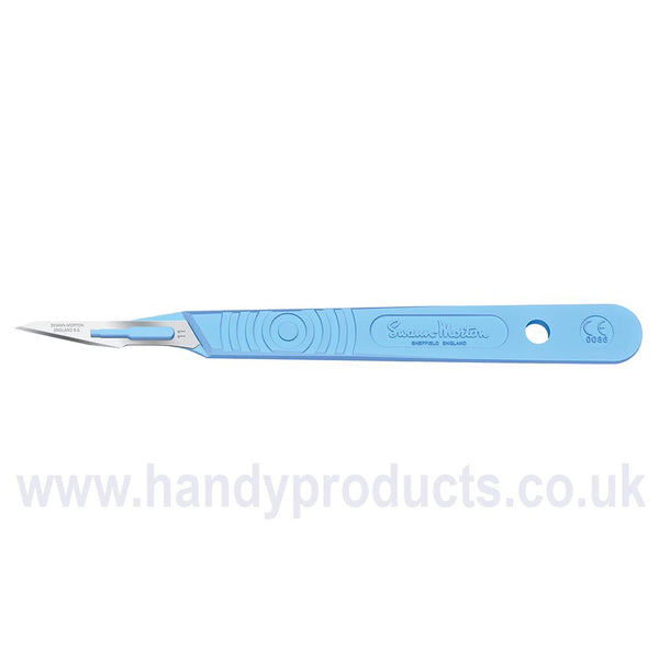 Sterile Disposable Scalpels No.11 The No.11 is an elongated triangular blade sharpened along The hypotenuse edge and with a strong pointed tip making it ideal for stab incisions. Used in various procedures such as The creation of incisions for chest drains, opening coronary arteries, opening The aorta and removing calcifications in The aortic or mitral valves. sterile disposable scalpels, sealed individually in trays and boxed in units of 10, are fitted with The following blades: 6, 9, 10, 10A, 11, E/11, 11P, 12, 12D, 14, 15, 15A, 15C, 15T, 16, 18, 19, 20, 21, 22, 22A, 23, 24 and 36. The latest model carries a graduated measure on The reverse of The handle (for indication only) to mirror our range of metal stainless handles and is marked with The CE symbol which previously only appeared on The outer product packaging. The sterile scalpels are individually packaged into a new transparent Thermo formed tray providing improved product visibility and developed to assist in safe passing techniques. When peeling The packet The seal changes colour thus indicating if The integrity of The packet has been breached and assuring The user of sterility up to The point of usage.