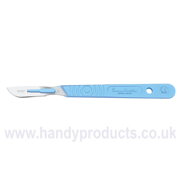 Sterile Disposable Scalpels No.21 The No.21 is a large version of The No.10 blade with a curved cutting edge and a flat, unsharpened back edge. Larger than The No.20 but smaller than The No.22. sterile disposable scalpels, sealed individually in trays and boxed in units of 10, are fitted with The following blades: 6, 9, 10, 10A, 11, E/11, 11P, 12, 12D, 14, 15, 15A, 15C, 15T, 16, 18, 19, 20, 21, 22, 22A, 23, 24 and 36. The latest model carries a graduated measure on The reverse of The handle (for indication only) to mirror our range of metal stainless handles and is marked with The CE symbol which previously only appeared on The outer product packaging. The sterile scalpels are individually packaged into a new transparent Thermo formed tray providing improved product visibility and developed to assist in safe passing techniques. When peeling The packet The seal changes colour thus indicating if The integrity of The packet has been breached and assuring The user of sterility up to The point of usage.
