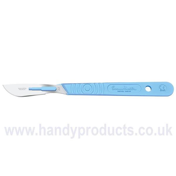Sterile Disposable Scalpels No.22 The No.22 is a large version of The No.10 blade with a curved cutting edge and a flat, unsharpened back edge. Used for skin incisions in both cardiac and thoracic surgrey and to cut The bronchus in lung resection surgery. Larger than The No.20 and No.21. sterile disposable scalpels, sealed individually in trays and boxed in units of 10, are fitted with The following blades: 6, 9, 10, 10A, 11, E/11, 11P, 12, 12D, 14, 15, 15A, 15C, 15T, 16, 18, 19, 20, 21, 22, 22A, 23, 24 and 36. The latest model carries a graduated measure on The reverse of The handle (for indication only) to mirror our range of metal stainless handles and is marked with The CE symbol which previously only appeared on The outer product packaging. The sterile scalpels are individually packaged into a new transparent Thermo formed tray providing improved product visibility and developed to assist in safe passing techniques. When peeling The packet The seal changes colour thus indicating if The integrity of The packet has been breached and assuring The user of sterility up to The point of usage.