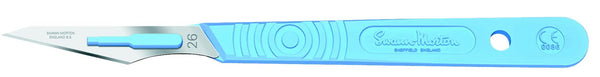 No 26 Disposable Scalpels sterile disposable scalpels, sealed individually in trays and boxed in units of 10, are fitted with The following blades: 6, 9, 10, 10A, 11, E/11, 11P, 12, 12D, 14, 15, 15A, 15C, 15T, 16, 18, 19, 20, 21, 22, 22A, 23, 24 and 36. The latest model carries a graduated measure on The reverse of The handle (for indication only) to mirror our range of metal stainless handles and is marked with The CE symbol which previously only appeared on The outer product packaging. The sterile scalpels are individually packaged into a new transparent Thermo formed tray providing improved product visibility and developed to assist in safe passing techniques. When peeling The packet The seal changes colour thus indicating if The integrity of The packet has been breached and assuring The user of sterility up to The point of usage.