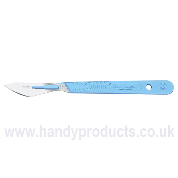 No 27 Disposable Scalpels sterile disposable scalpels, sealed individually in trays and boxed in units of 10, are fitted with The following blades: 6, 9, 10, 10A, 11, E/11, 11P, 12, 12D, 14, 15, 15A, 15C, 15T, 16, 18, 19, 20, 21, 22, 22A, 23, 24 and 36. The latest model carries a graduated measure on The reverse of The handle (for indication only) to mirror our range of metal stainless handles and is marked with The CE symbol which previously only appeared on The outer product packaging. The sterile scalpels are individually packaged into a new transparent Thermo formed tray providing improved product visibility and developed to assist in safe passing techniques. When peeling The packet The seal changes colour thus indicating if The integrity of The packet has been breached and assuring The user of sterility up to The point of usage.