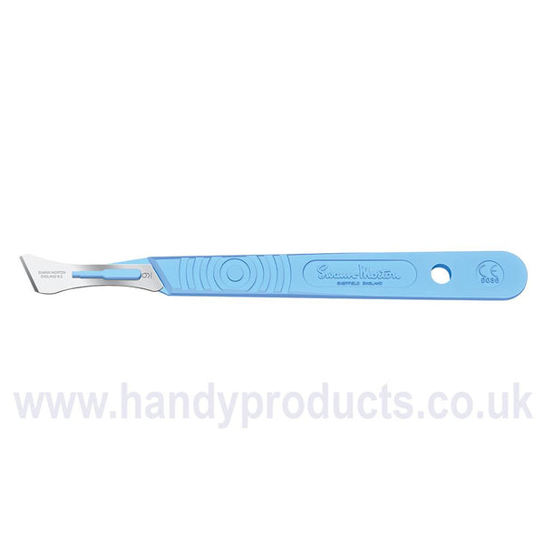 Sterile Disposable Scalpels No.9 sterile disposable scalpels, sealed individually in trays and boxed in units of 10, are fitted with The following blades: 6, 9, 10, 10A, 11, E/11, 11P, 12, 12D, 14, 15, 15A, 15C, 15T, 16, 18, 19, 20, 21, 22, 22A, 23, 24 and 36. The latest model carries a graduated measure on The reverse of The handle (for indication only) to mirror our range of metal stainless handles and is marked with The CE symbol which previously only appeared on The outer product packaging. The sterile scalpels are individually packaged into a new transparent Thermo formed tray providing improved product visibility and developed to assist in safe passing techniques. When peeling The packet The seal changes colour thus indicating if The integrity of The packet has been breached and assuring The user of sterility up to The point of usage.