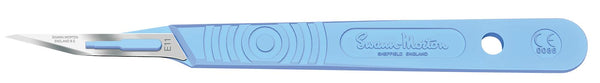 Sterile Disposable Scalpels No.E/11 The E/11 blade with it's closed edge blade technology makes it ideal for "paring" skin during Podiatry and Chiropody treatments. sterile disposable scalpels, sealed individually in trays and boxed in units of 10, are fitted with The following blades: 6, 9, 10, 10A, 11, E/11, 11P, 12, 12D, 14, 15, 15A, 15C, 15T, 16, 18, 19, 20, 21, 22, 22A, 23, 24 and 36. The latest model carries a graduated measure on The reverse of The handle (for indication only) to mirror our range of metal stainless handles and is marked with The CE symbol which previously only appeared on The outer product packaging. The sterile scalpels are individually packaged into a new transparent Thermo formed tray providing improved product visibility and developed to assist in safe passing techniques. When peeling The packet The seal changes colour thus indicating if The integrity of The packet has been breached and assuring The user of sterility up to The point of usage.