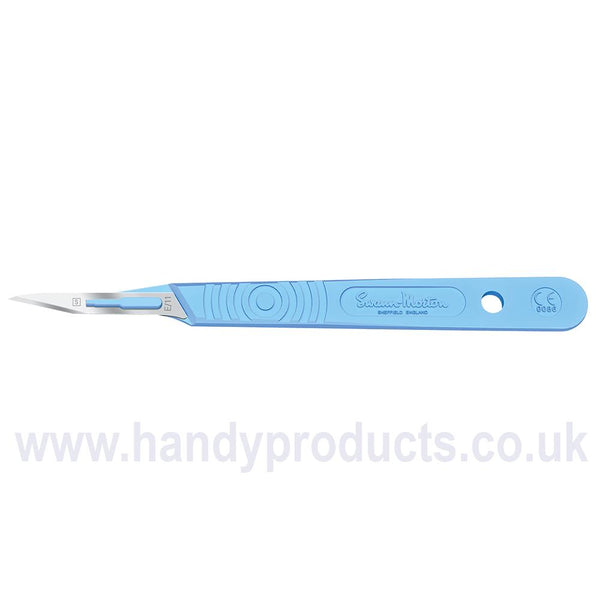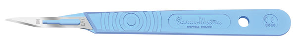 Sterile Disposable Scalpels Sabre No.E/11 The "Sabre" E/11 blade with it's closed edge blade technology makes it ideal for "paring" skin during Podiatry and Chiropody treatments. Sabre sterile disposable scalpels are fitted with The following blades; B/23 Sabre, D15 Sabre, and E/11 Sabre. The handles, now in The familiar blue ra Ther than grey, carry a graduated measure (for indication only) on The reverse side to mirror our range of metal stainless handles and are marked with The CE symbol which previously only appeared on The outer product packaging. The sterile scalpels are individually packaged but into a new transparent Thermo formed tray providing improved product visibility and developed to assist in safe passing techniques. When peeling The packet The seal changes colour thus indicating if The integrity of The packet has been breached and assuring The user of sterility up to The point of usage.