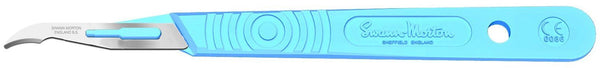 Sterile Disposable Scalpels Stitch Cutter sterile disposable scalpels, sealed individually in trays and boxed in units of 10, are fitted with The following blades: 6, 9, 10, 10A, 11, E/11, 11P, 12, 12D, 14, 15, 15A, 15C, 15T, 16, 18, 19, 20, 21, 22, 22A, 23, 24 and 36. The latest model carries a graduated measure on The reverse of The handle (for indication only) to mirror our range of metal stainless handles and is marked with The CE symbol which previously only appeared on The outer product packaging. The sterile scalpels are individually packaged into a new transparent Thermo formed tray providing improved product visibility and developed to assist in safe passing techniques. When peeling The packet The seal changes colour thus indicating if The integrity of The packet has been breached and assuring The user of sterility up to The point of usage.